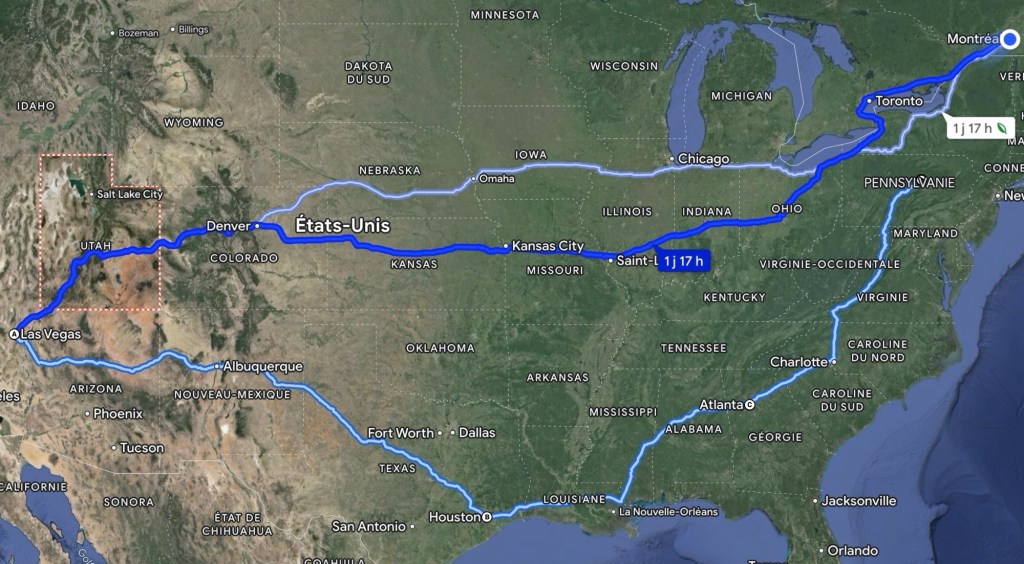 Je choisis d’éviter Toronto et de plutôt passer au sud des lacs Ontario et Erié. Donc, état de New-York, un petit bout de la Pennsylvanie, Ohio, Indiana, Illinois, Missouri puis Kansas et Colorado.
