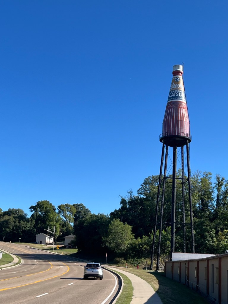 Collinsville. En banlieue de St-Louis. La plus grosse bouteille de ketchup au monde. Ma question : Pourquoi ? La réponse : En 1949, la municipalité avait besoin d’un château d’eau. Monsieur Gerhart S. Suppiger, président de l’usine de ketchup du coin, y a vu une opportunité de faire de la pub pour son produit nommé Catsup. Cette bouteille de Catsup est donc un château d’eau. Aujourd’hui, elle est inscrite au registre national des lieux historiques des États-Unis. C’est-y pas formidable !