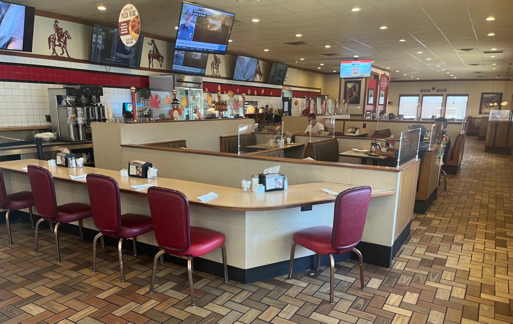 Wa ! Le look du resto toi ! Ça me rappelle les Zellers. Note : La serveuse m’appelle « Honey ». Mais bon. Elle a beau s’essayer, c’est pas Charlize Theron mettons. 😂