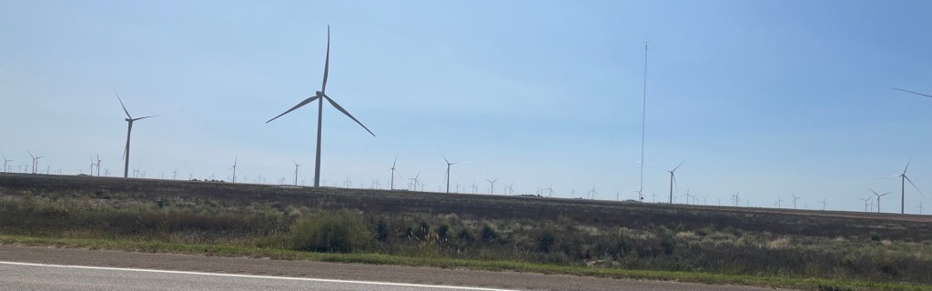 Il vente sur les plaines du Kansas. Pas pour rien que le paysage est parsemé de centaines (vraiment !) d’éoliennes. … et que la bagnole, et sa roulotte, sont ballottées à qui mieux mieux.