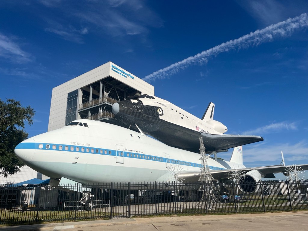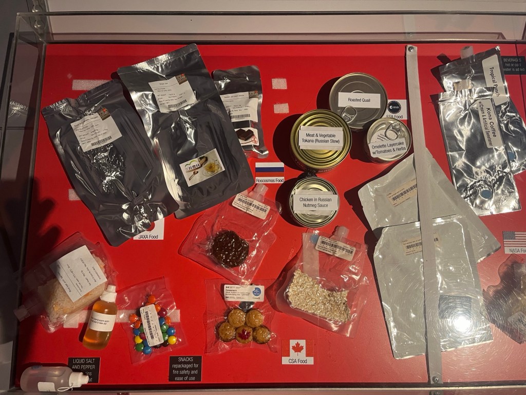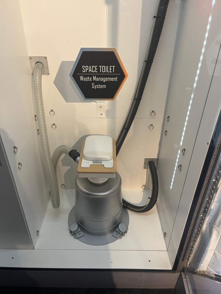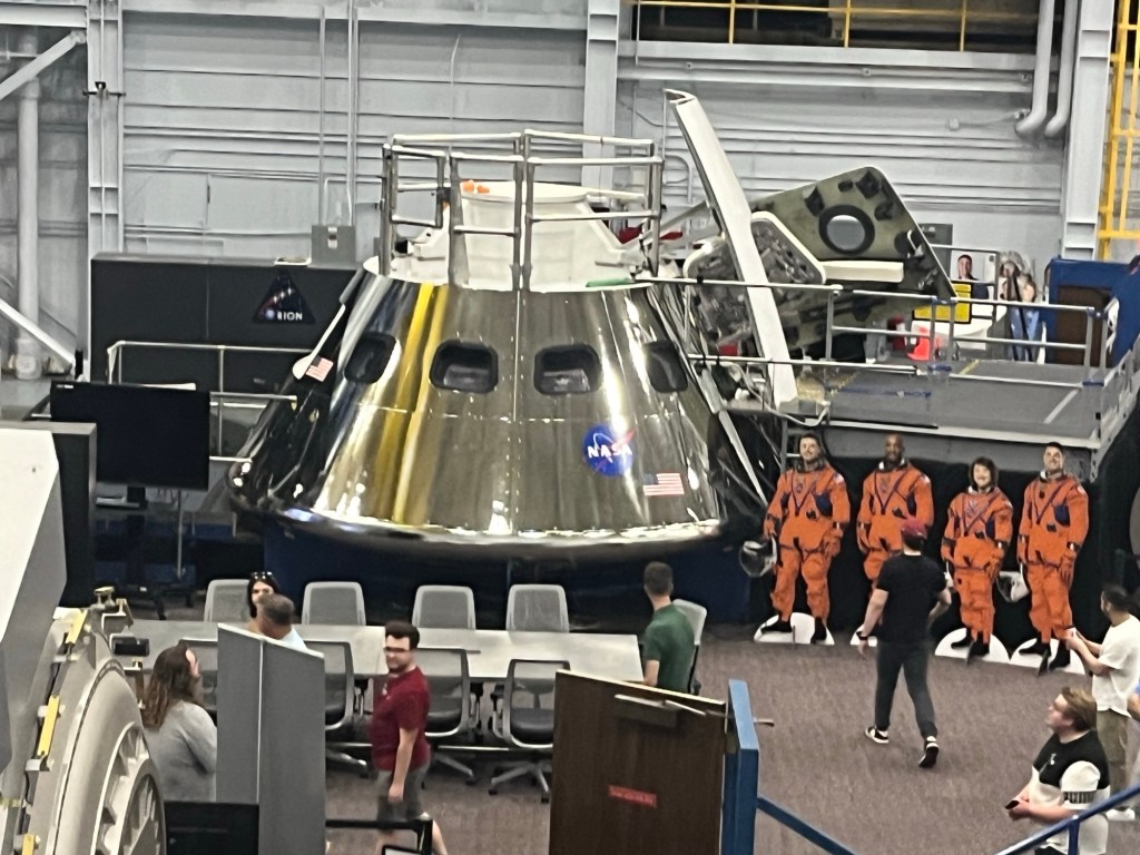 Mais les trois fusées Saturn V dédiées à ses vols étaient déjà construites. L’une (la seule pleinement opérationnelle) est exposée ici à Houston, une seconde (que j’ai vu en 1976) se trouve au Cap Canaveral en Floride, et la troisième a servi à faire des essais sur un site en Alabama.Du bon manger. Pour la Station Spatiale Internationale. Tout est déshydraté (question de poids et d’espace). Suffit de rajouter de l’eau et chauffer.Building 9 : C’est là qu’on conçoit les prototypes des engins spatiaux, ainsi que les maquettes d’entraînements.Le vaisseau Orion qui, propulsé par la fusée Artemis, mènera les astronautes vers la Lune.Ce drapeau est mis en berne lorsqu’il n’y a pas d’américain dans l’espace. Il n’a pas été baissé depuis 27 ans (donc 27 ans de présence ininterrompue d’au moins un(e) américain(e) ).Le 747 NASA 905 (avec une maquette de navette).Mon doigt sur une pierre lunaire rapportée par Apollo 17.On retrouve la même toilette sur la Station Spatial Internationale. Le confort toi !Un petit troupeau de bœufs (endormis ?) à longues cornes jouxte le Centre spatial.