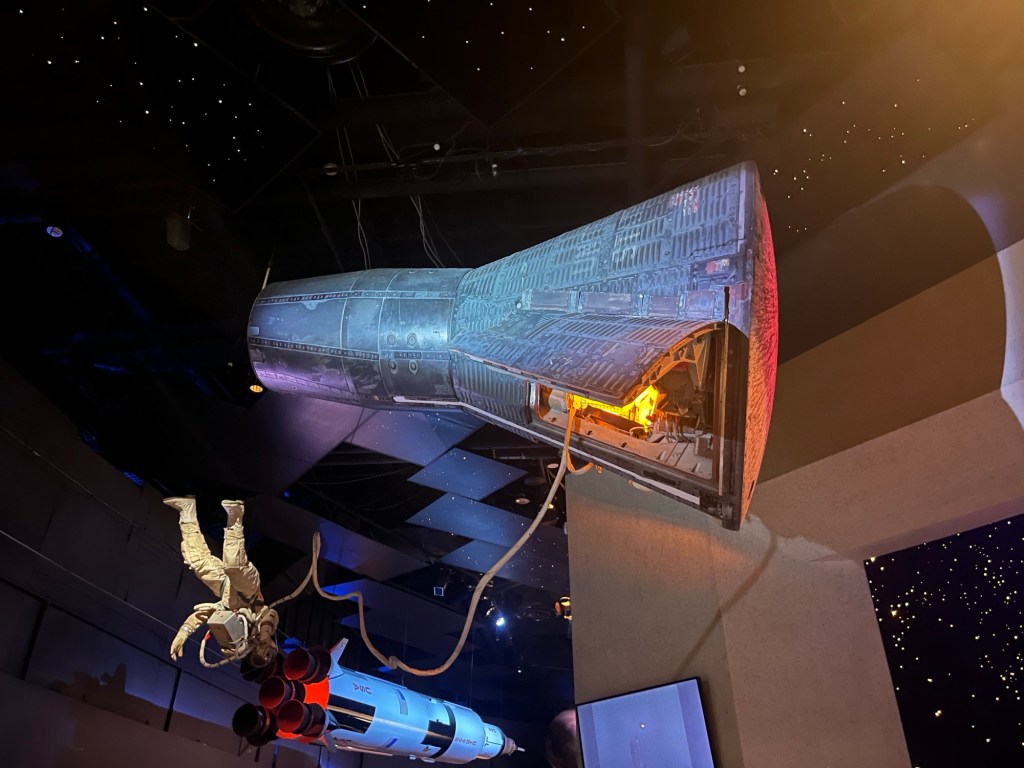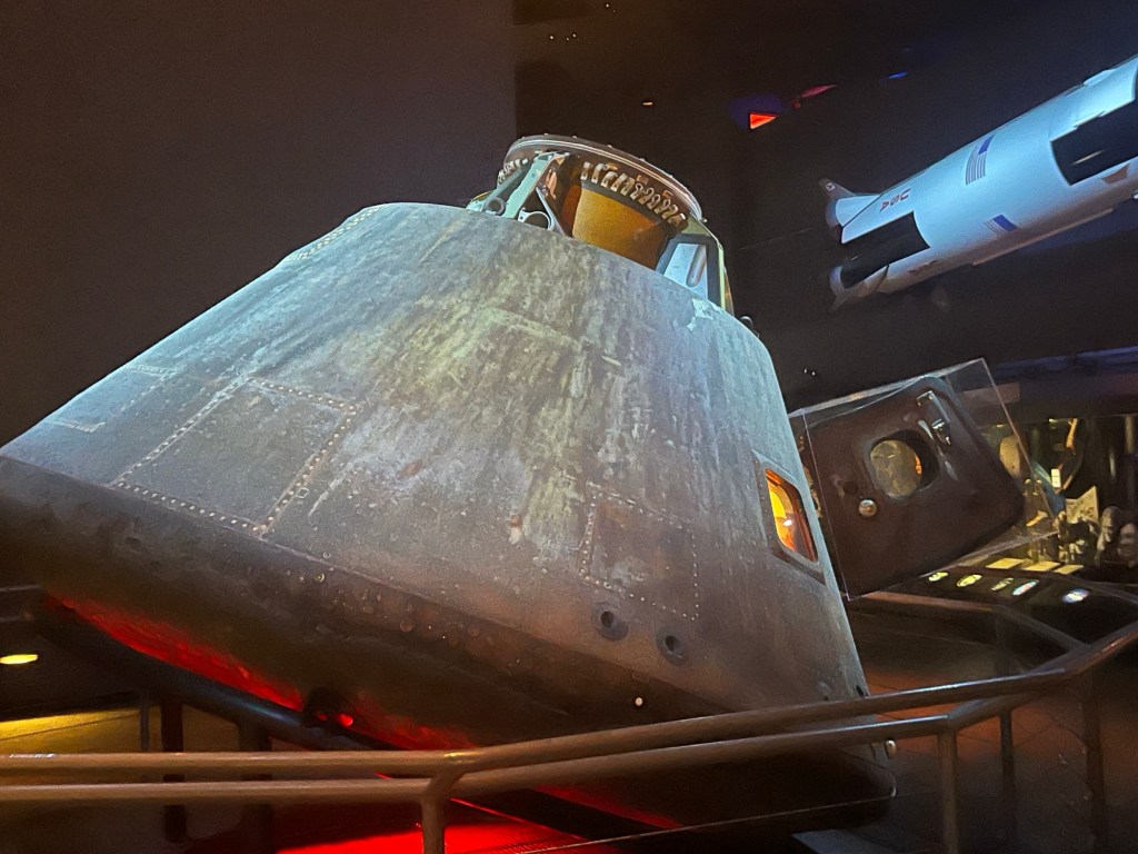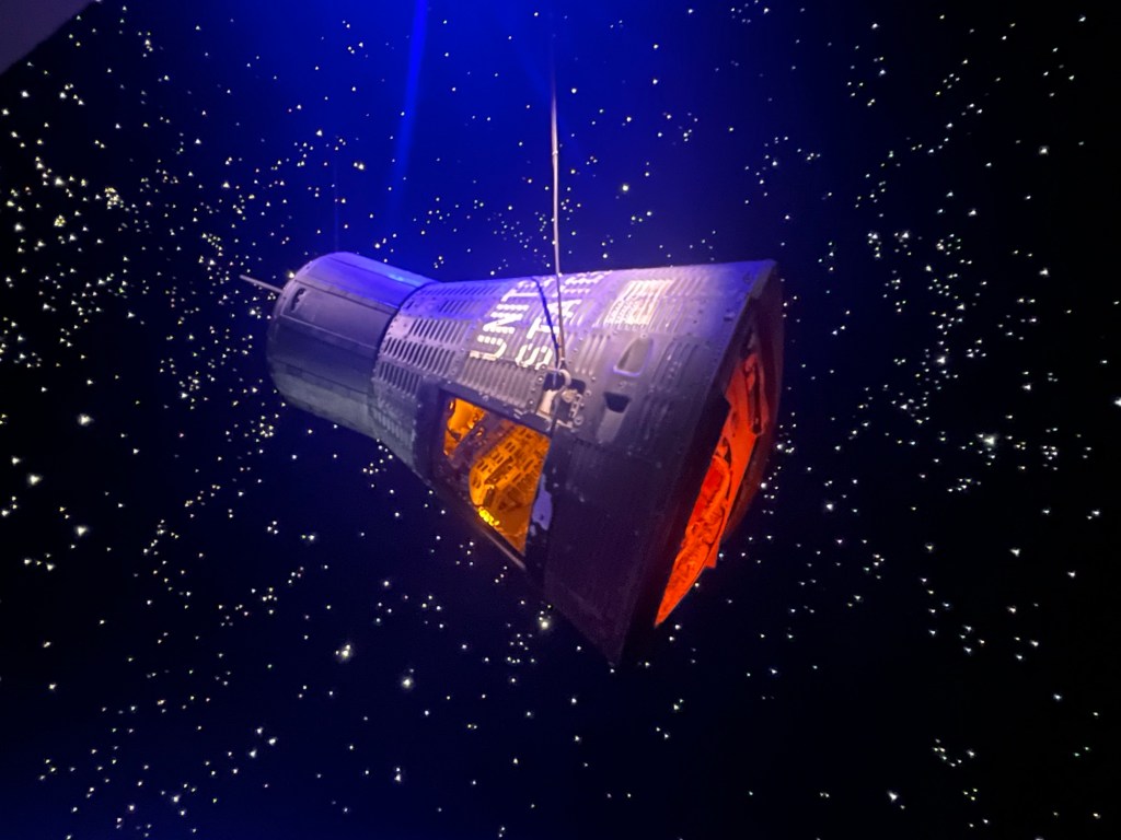 Capsule Mercury 9. Gordon Cooper. 15-16 mai 1963.Vaisseau Gemini V. Gordon Cooper et Pete Conrad. Du 21 au 29 août 1965. P.s. : Leçon de vie : Toujours prendre plusieurs photos. D’un coup qu’il y en aurait une pas floue 🥴.Bon. En fin de compte, j’y suis retourné pour en prendre une autre 😋.Et, parlant de photos, celle-ci prise justement par Gemini V. Une des premières photos couleurs de la Terre.Module de commandes d’Apollo 17. La dernière mission lunaire. Du 7 au 19 décembre 1972. Avec Ronald Evans, Eugene Cernan et Harrisson Schmitt. Ces deux derniers étant, justement, les derniers américains à avoir posé les pieds sur la Lune. Notons aussi que, des douze ayant eu cette chance, Schmitt est le seul civil (un géologue). Les onze autres étant des militaires.Le programme Apollo s’est terminé avec la mission 17. Le désintérêt du public (et accessoirement 🤔 les coûts faramineux) a poussé la NASA à annuler les missions 18, 19 et 20.