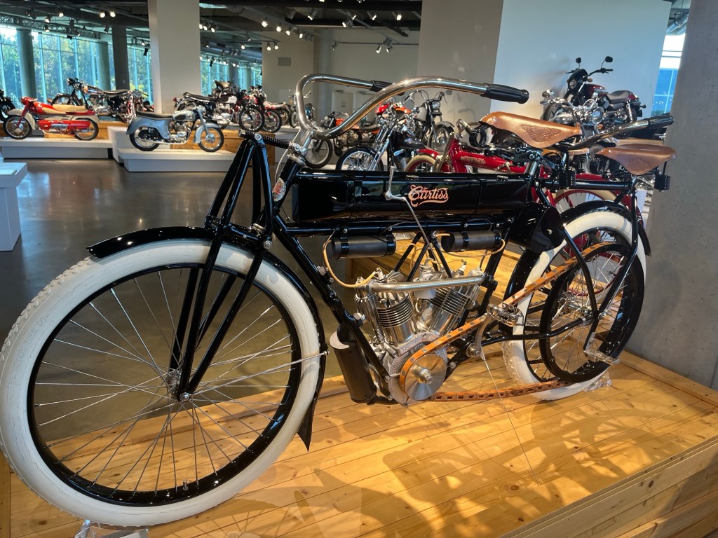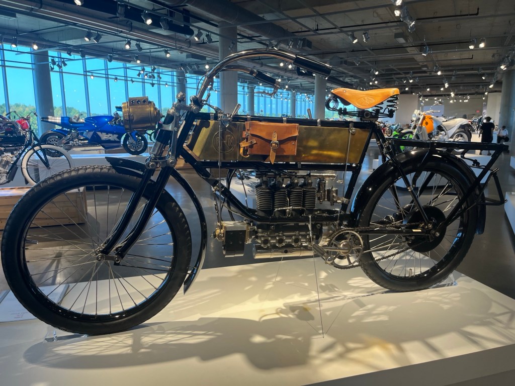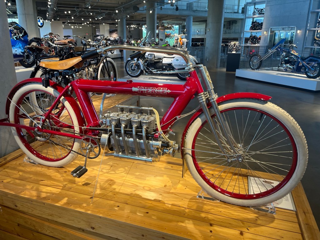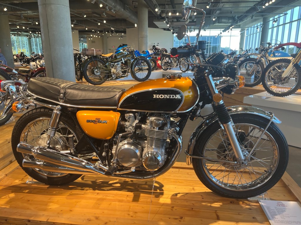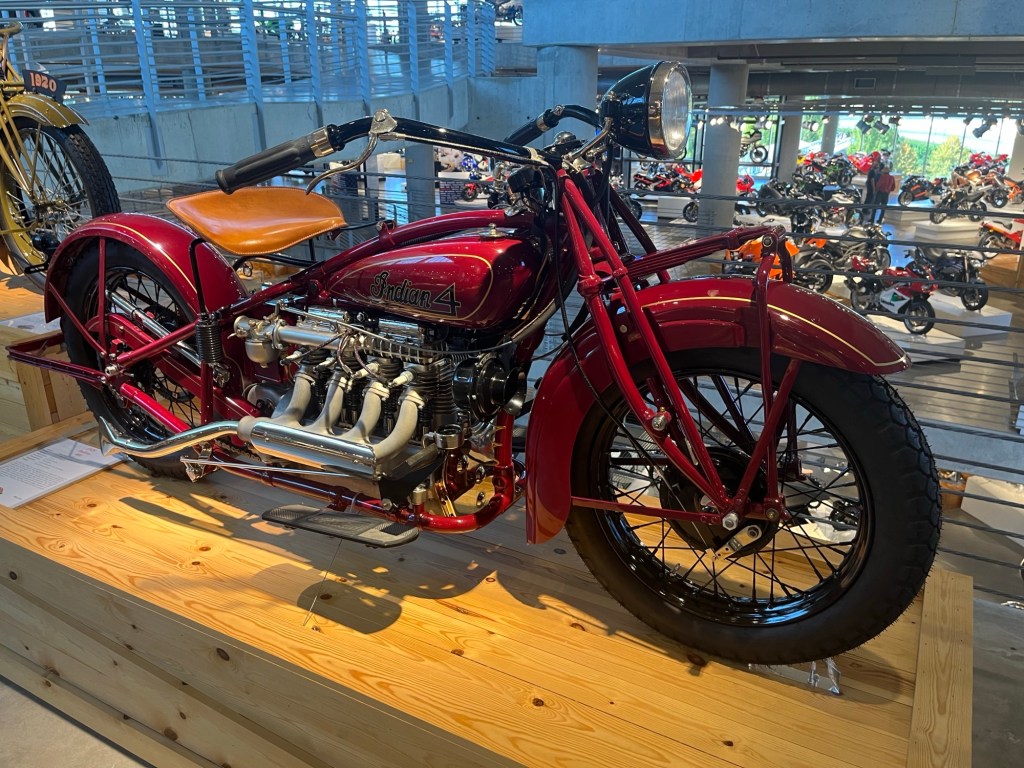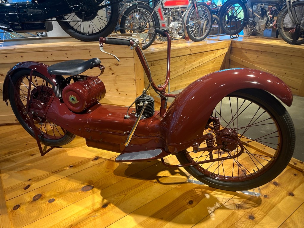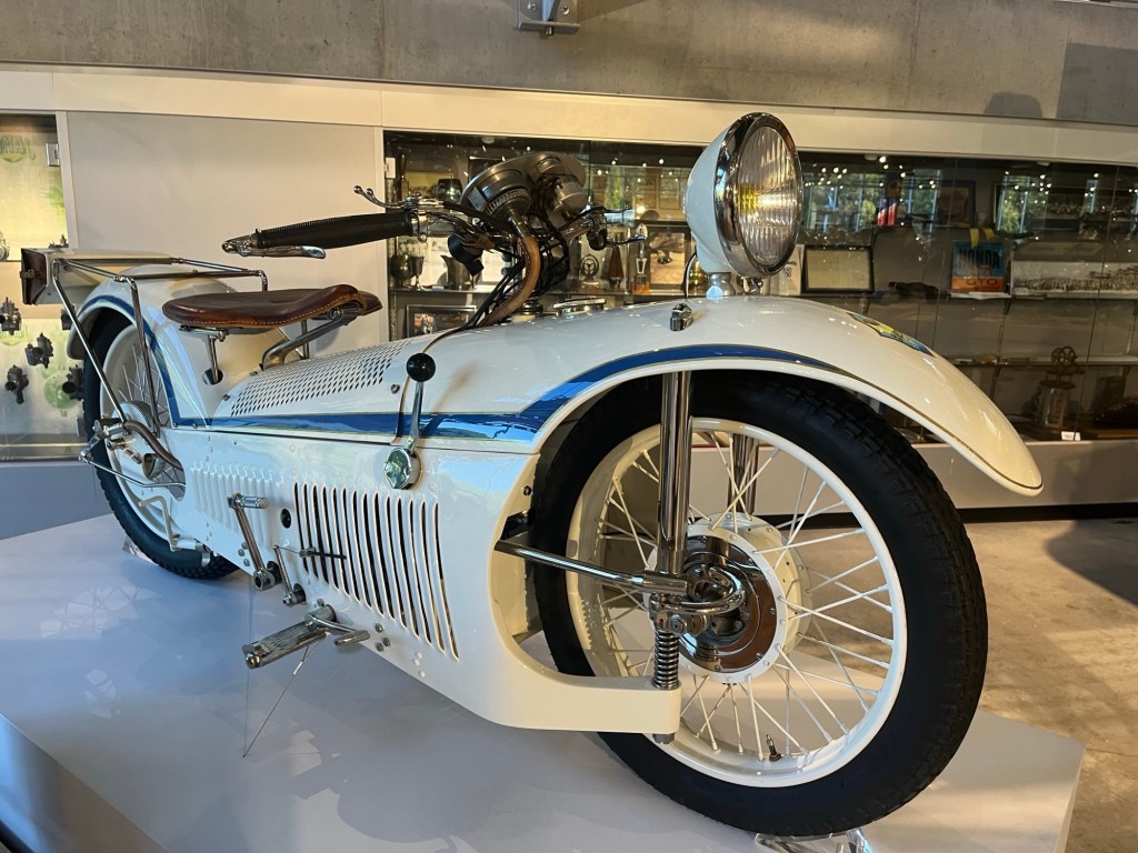 Commençons par celle-ci. Une Honda 500 Four … identique à ma première moto (mais brune).Une Indian 1932. Moto des policiers de Los Angeles.Cushman Super Silver Eagle 1965. Une espèce de scooter déguisé en Indian (355 cc quand même).Cezeta CZ 1959. Tchèque. Conçue pour le camping.Honda Z50R. Devrait rappeler un certain souvenir (constitué d’un paquet de bleues) à Grande Sœur.BMW R60/Steib 1966.Guzzi 1924.Curtiss Tandem 1908. Notez les deux sièges.Pierce Four 1910. Ma préférée.Kawasaki Z2300 V12. 2,300 cc : Qu’est-ce ça donne ?NSU Supermax 1961. Allemande.Bohmerland 1925.Triumph Speed Twin 1938.FN (Fabrique Nationale) Light Four 1906. Une belge. Donc le nom du modèle est en anglais 🥴.Marsh 1904.Ner-a-Car Model B 1926. La gueule toi !Harley-Davidson CAC 1934.Harley-Davidson JD 1925. Pour la livraison de biscuits.Indian 401 1928.Majestic 1929. Française. Donc, encore une fois, un nom en anglais 🫣.Zundapp KS 750. Moto de l’armée allemande durant la Seconde Guerre.Ariel Square Four 1958.