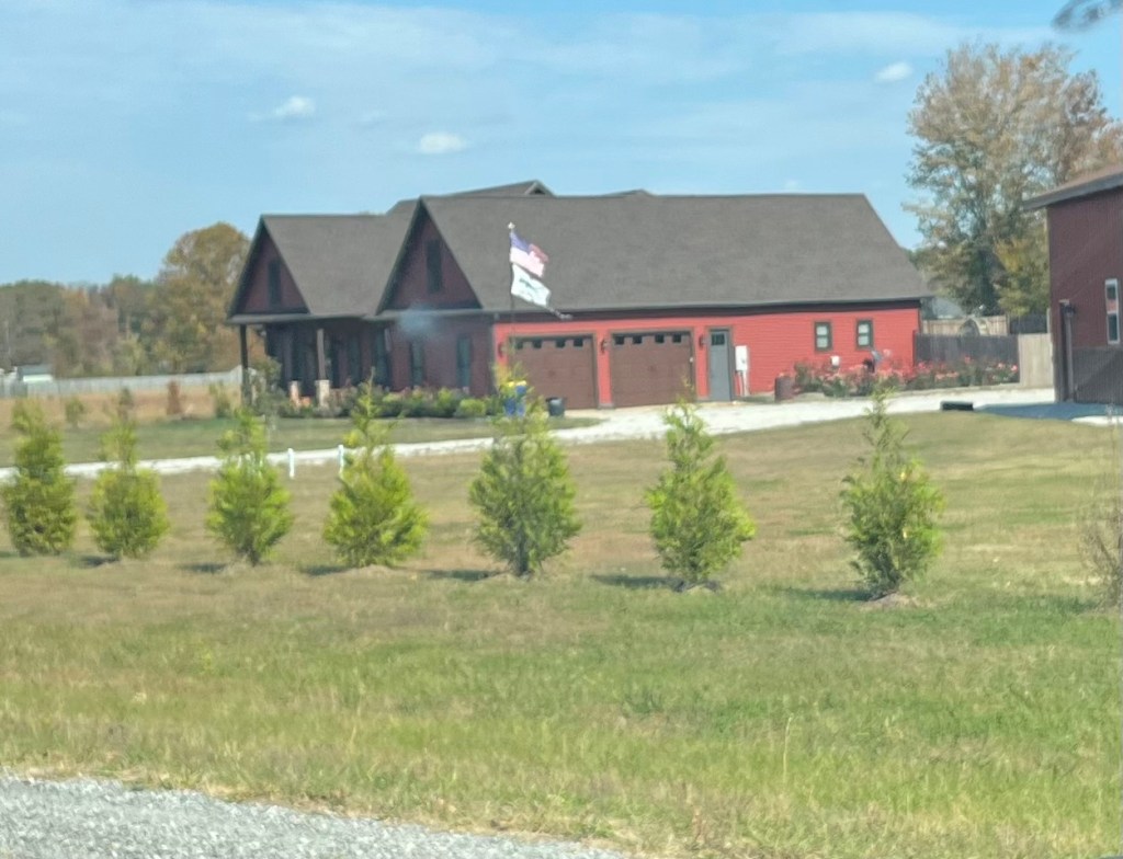 3. On ne voit pas bien mais, sur le mât de ce terrain privé, il y a deux drapeaux. Celui des États-Unis … et un autre avec une arme d’assaut. Me demande bien pour qui ils votent ?